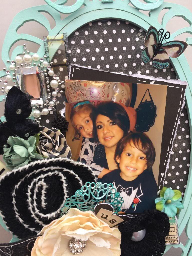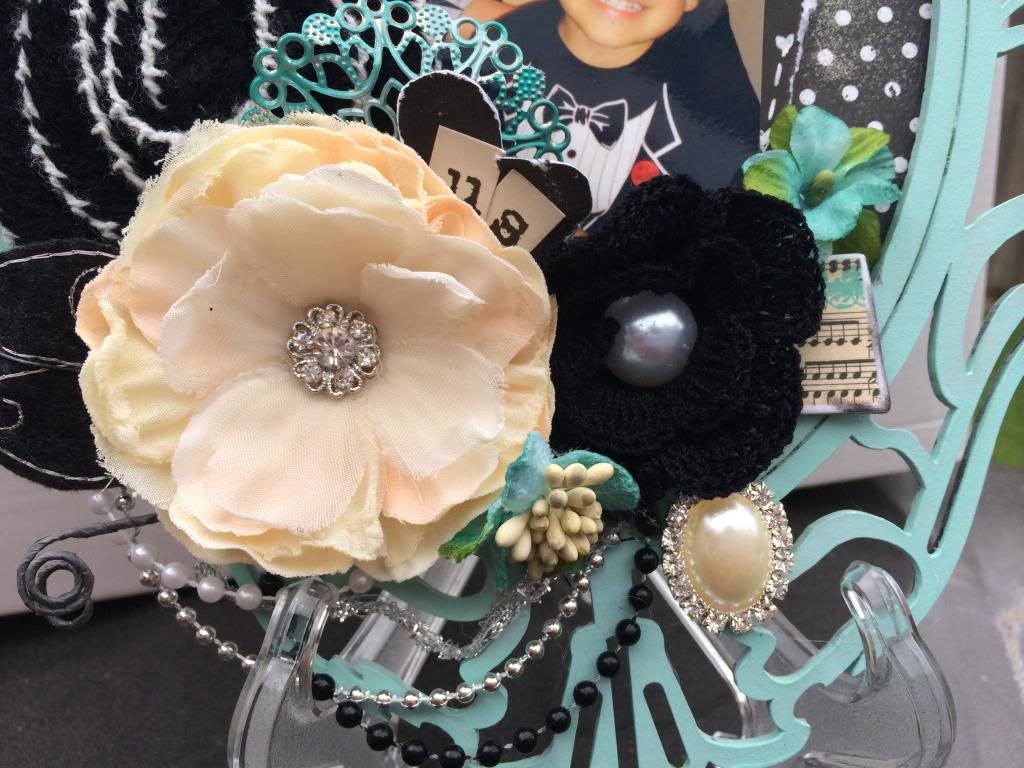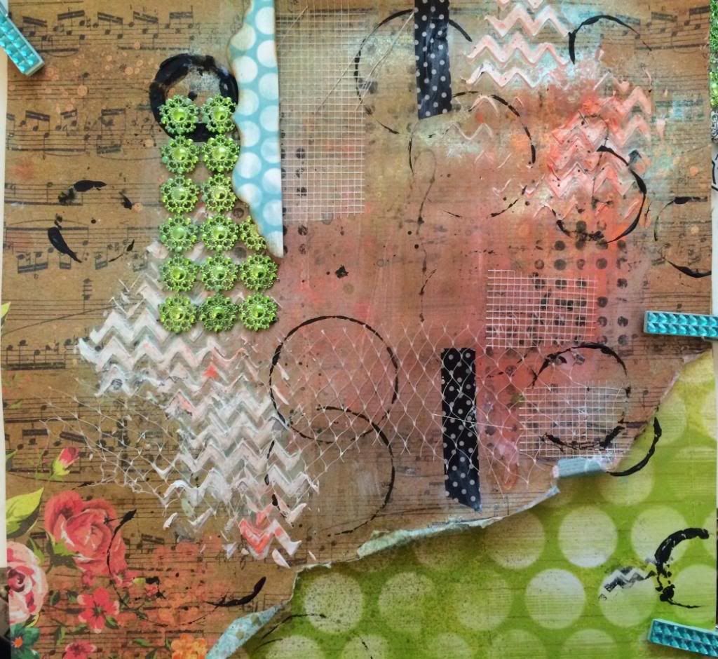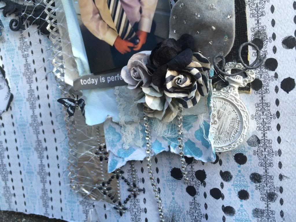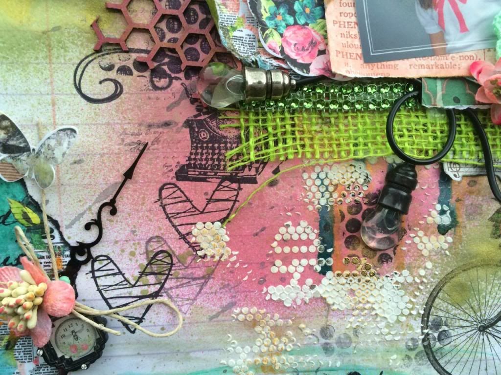 So I just loved mixing black and white with all these bright floral patterns in this paper line collection . I gave the base sheet a coat of clear gesso and misted away. The photos never show how much shimmer these Heidi Swapp & Lindys Mists really shine on the page. Lots of texture layers going on here with the cardboard, drywall tape & threading.